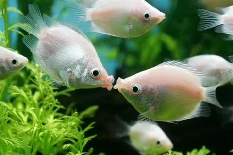 Гурами Целующийся розовый — крупная лабиринтовая рыба с оригинальной внешностью и поведением. Имеет равномерную розово-перламутровую