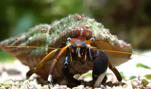 Белолапый рак-отшельник — привлекательный морской ракообразный с контрастной окраской. Тело скрыто в раковине брюхоногой улитки
