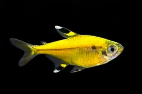 Небольшая стайная рыбка с полупрозрачным, серебристо-золотистым телом, которое флуоресцирует (светится) под синей (actinic) лампой. Характерные черты — чёрное пятно на спинном плавнике и бело-чёрно-жёлтые полосы на анальном и брюшных плавниках. Имеет жировой плавник. Молодые особи выглядят более прозрачными