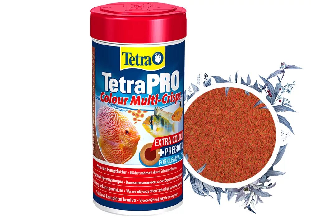 ТетраПРО — это новый эталон среди кормов для рыб. Высококачественный полноценный корм изготавливается по бережной низкотемпературной технологии, что позволяет сохранить высокую питательную ценность ТетраПРО Колор Мульти-Криспс. По сравнению с обычными хлопьями, универсальные чипсы впитывают меньше воды, что позволяет повысить концентрацию питательных веществ в единице объема корма. Все корма ТетраПРО также обеспечивают оптимальное соотношение белков и жиров, благодаря чему организм рыбы использует белки исключительно для наращивания мышц, а незаменимые жирные кислоты, которыми обогащен корм, — для выработки энергии. Концентрат на основе каротиноидов для улучшения цвета входит в состав универсальных чипсов и делает природный окрас рыб еще более насыщенным. Благодаря инновационной технологии изготовления двухцветного корма визуально демонстрируются дополнительные преимущества чипсов. Они крошатся значительно меньше, чем обычные хлопья, что позволяет минимизировать пыль в баночках. Высококачественные пребиотики в составе, главный источник питания полезных бактерий, в значительной степени стимулируют рост и метаболизм полезных бактерий в кишечнике, что позволяет минимизировать загрязнение воды.